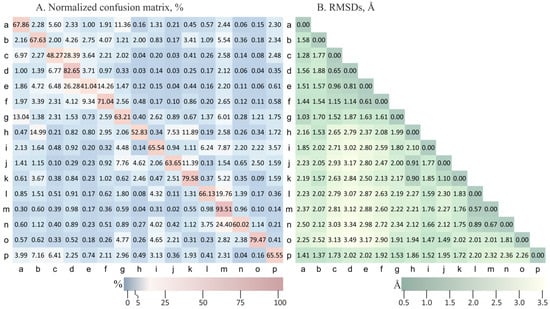 Misclassifications that occurred between relatively distant classes in the alphabet (e.g., for ‘a’ and ‘g’, 11.4% of ‘a’ predicted as ‘g’ and 13% of ‘g’ predicted as ‘a’) could also be explained by the proximity of these classes in terms of the RMSDs (RMSD (‘a’, ‘g’) = 1.035 Å). PB ‘a’ was the closest neighbor to PB ‘g’ and vice versa, although this is not the case for all the PB pairs (Figure 2B). For example, for the PB pair with the maximum RMSD (‘d’, ‘o’) = 3.494 Å, these PBs (corresponding to secondary structure classes C-caps of the α-helix and β-sheet) have few misclassifications between them.