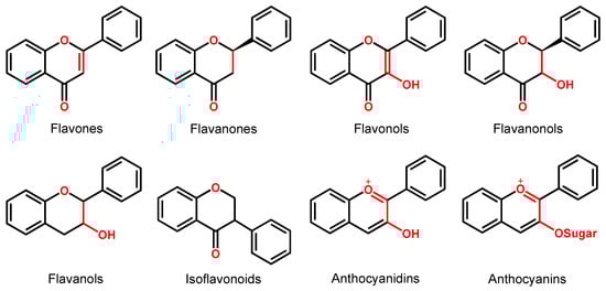 Depending on their chemical structure, flavonoids can be classified into seven major groups (Figure 2): flavones (flavonones), flavanones, flavonols (flavon-3-ols), flavanonols (3-hydroxyflavanones), flavanols (flavan-3-ols), isoflavonoids (that correspond to an isomeric change on the B-ring bond), anthocyanidins and anthocyanins. More than 6000 flavonoids have been isolated and studied, with some of the most important being depicted in Table 1, along with the major sources of dietary intake.