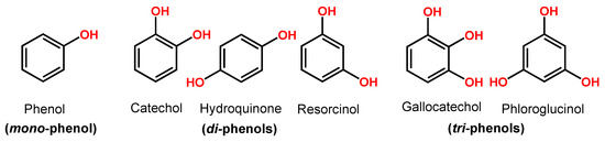 Phenol is a compound with one hydroxy (–OH) group linked directly to a benzene ring. Catechol, hydroquinone and resorcinol (benzenediols) have two –OH groups, and gallocatechol and phloroglucinol (benzenetriols) have three –OH groups (Figure 3).