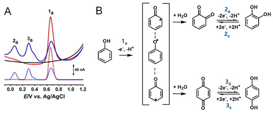 Phenol undergoes an irreversible, pH-dependent oxidation at the glassy carbon electrode (GCE), which occurs in one-step at the –OH group, with the transfer of one electron and one proton, corresponding to peak 1a at Ep = +0.65 V at pH = 7.0, vs. Ag/AgCl (3 M KCl) (Figure 4A) [13,14,15]. Phenol oxidation leads to the formation of a thermodynamically unstable phenoxy radical that coexists in three resonant forms (at the ortho- and para-positions with higher spin density, and at the meta-position with lower spin density), being immediately stabilized by hydrolysis, resulting in the formation of two electroactive oxidation products: ortho-quinone and para-quinone (Figure 4B). The ortho-quinone and para-quinone are further reversibly reduced—the ortho-quinone to catechol (peak 3c) and the para-quinone to hydroquinone (peak 2c) (Figure 4B)—in two parallel pH-dependent processes occurring with the transfer of two electrons and two protons each. The reversible peak potentials correspond to the catechol and hydroquinone electron-transfer mechanisms.