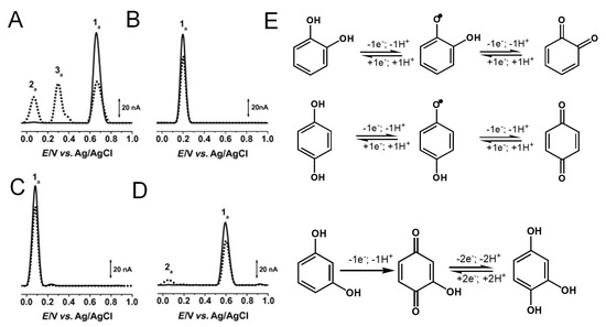 (A–D) DPVs baseline corrected at GCE, (▬) first and (▪▪▪) second scans, obtained in solutions at pH =7.0 of: (A) 25 μM phenol, (B) 25 μM catechol, (C) 25 μM hydroquinone, and (D) 25 μM resorcinol, and (E) oxidation mechanisms of catechol, hydroquinone and resorcinol. Adapted from [13] with permission.