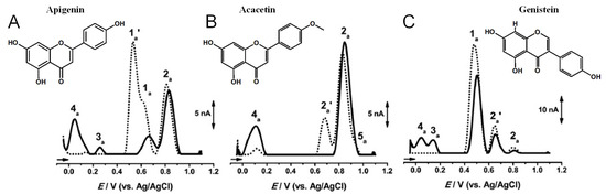 DPVs baseline corrected at GCE, (▪▪▪) first and (▬) second scans, obtained in a solution at pH = 7.0, of 10 μM: (A) apigenin, (B) acacetin, and (C) genistein. Adapted from [25] with permission.