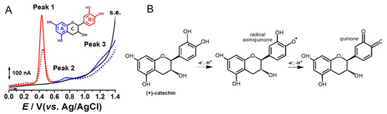 (A) DPVs at GCE, obtained in a solution of 10 μM catechin, at pH = 2.2: (▬, ▬) first scan, (•••, •••) second scan, and in (▬) supporting electrolyte (s.e.), and (B) proposed catechin oxidation mechanism. Reproduced from [72] with permission.