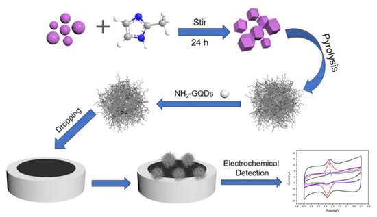 Schematic representation of an electrochemical sensor for the detection of luteolin, based on ZIF-derived Co3O4 at N-doped CNTs-amino-functionalized Gr QDs composites modified GCE (Co3O4@N-CNTs/NH2-GQD/GCE). Adapted from [129] with permission.
