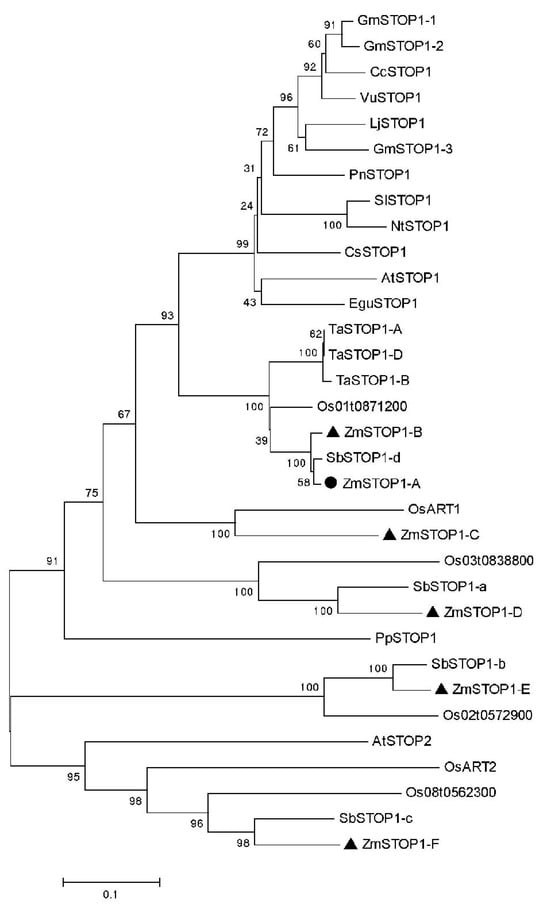 The phylogenetic tree of STOP1-like proteins from maize (ZmSTOP1-A, Zm00001d042686; ZmSTOP1-B, Zm00001d012260; ZmSTOP1-C, Zm00001d023558; ZmSTOP1-D, Zm00001d034783; ZmSTOP1-E, Zm00001d016911; ZmSTOP1-F, Zm00001d031895) and other species was constructed using the neighbor-joining method in MEGA 5.1.