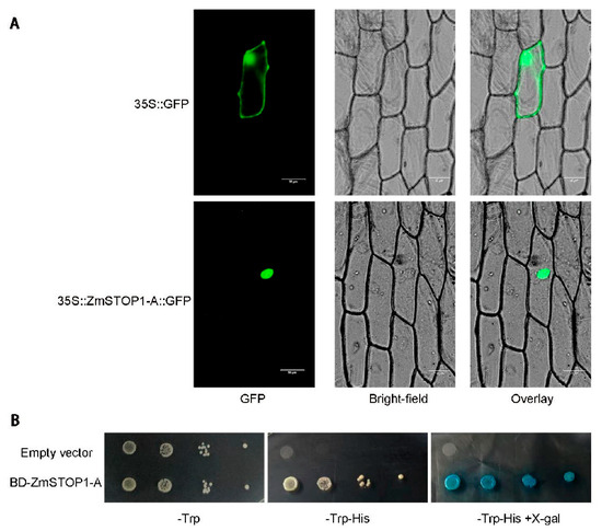 When transiently expressed in onion epidermal cells, ZmSTOP1-A::GFP fluorescence was only observed in the nucleus (Figure 3A) in comparison with 35S::GFP control, which localized to both the nucleus and plasma membrane. This indicates that ZmSTOP1-A is a nucleus protein.