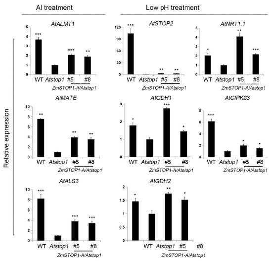 It has been shown that Arabidopsis AtSTOP1 responds to Al toxicity and low pH by regulating the expression of different set of genes [13]. Thus, the expression of AtALMT1, AtMATE, and AtALS3 (Al-responsive), and AtSTOP2, AtGDH1, AtGDH2, AtNRT1.1, and AtCIPK23 (low-pH-responsive) were examined here. Under Al stress, Al-responsive genes expression was partially restored in all ZmSTOP1-A/Atstop1 plants compared to Atstop1 (Figure 5). Under low-pH conditions, AtGDH1, AtGDH2, and AtNRT1.1, but not AtSTOP2 and AtCIPK23, expression fully recovered in ZmSTOP1-A/Atstop1 plants (Figure 5). These expression patterns align with the RRG of ZmSTOP1-A/Atstop1 plants under Al toxicity and low-pH conditions.