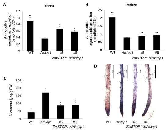 Ectopic expression in the Arabidopsis Atstop1 mutant is a widely used system to assay Al tolerance genes. For instance, under Al stress condition, VuSTOP1 and AtSTOP2 partially rescued Atstop1 Al sensitivity by restoring the expression of AtALS3 and AtMATE, but not AtALMT1 [16,33]. Similarly, PpSTOP1 partially recovered AtALMT1, AtMATE, and AtALS3 expression and roots growth [19]. Here, ZmSTOP1-A also partially restored AtALMT1, AtMATE, and AtALS3 expression in Atstop1 under Al stress (Figure 5), correlating with increased organic acid secretion and lower Al accumulation (Figure 6). This is consistent with findings for NtSTOP1 [19], suggesting that the STOP1-organic acid transporter module is highly conserved for Al detoxification across plants.