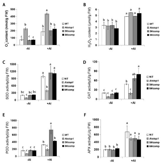 Effects of Al toxicity on reactive oxygen species in WT, Atstop1, and ZmSTOP1-A/Atstop1 plants. Superoxide anion (O2−) (A) and hydrogen peroxide (H2O2) (B) content and activity of SOD (C), CAT (D), POD (E), and APX (F) in roots after 24 h exposure with 0 or 20 μM AlCl3 (pH 4.9). Values are mean ± SD (n ≥ 10) of three separated experiments. Different letters indicate significant difference (Tukey’s test, p < 0.05).