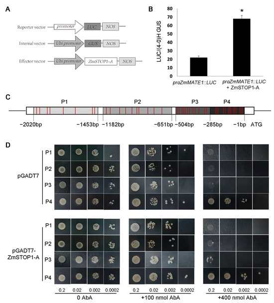 For the yeast one-hybrid assay [42], the promoter region of ZmMATE1 was amplified and cloned into the pAbAi vector. ZmSTOP1-A was fused to the GAL4 activation domain (AD) in the pGADT7 vector. Finally, this pair of constructs was then introduced into the Y1H gold yeast strain.