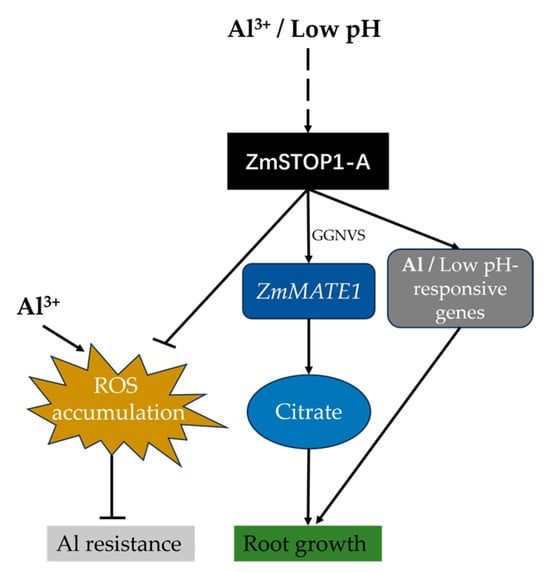 A hypothetical model describing the role of ZmSTOP1-A in the transcriptional regulation of genes responding to aluminum (Al) toxicity and low-pH stress in maize. Al toxicity and low-pH conditions do not directly induce the transcriptional expression of ZmSTOP1-A. Instead, ZmSTOP1-A regulates the expression of genes responsive to Al and low pH. Specifically, ZmSTOP1-A can directly activate the expression of ZmMATE1 to detoxify Al through citrate secretion. Additionally, ZmSTOP1-A enhances Al tolerance by inhibiting the accumulation of reactive oxygen species (ROS).