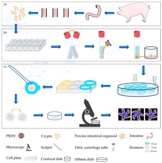 Figure 1 shows an overview of the protocol. As shown in the flow chart, intestinal crypts were first isolated from the duodenum of piglets inoculated in Matrigel and cultured in dishes until a sufficient number was obtained for subsequent experiments. Next, intestinal organoids were slightly digested by GCDR, and a PEDV suspension was added after organoid cavity splitting. The virus adsorbed on the cell surface in the chamber of the intestinal organoid was seeded in Matrigel for culture (Figure 1a,b). After successful infection, intestinal organoids were collected and loaded onto cell strainers that were placed in 100 mm dishes for washing, fixation, permeation, and blocking. Then, cell strainers within the intestinal organoids were transferred to a six-well cell plate to label primary and secondary antibodies. The liquid was added above the cell strainers and sucked out between the strainers and the plate, effectively preventing organoid loss. The mesh surfaces of the cell strainers with adsorbed intestinal organoids were cut with a scalpel, turned upside down, inverted onto the bottom of the confocal dish, and observed using 3D imaging under a fluorescence microscope (Figure 1c).
