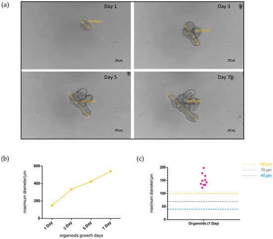 Crypts were successfully isolated from the piglets and transplanted into Matrigel for cultured organoids. The growth of the intestinal organoids was observed and recorded from day 1 to 7. One porcine intestinal organoid growth process was visualized, and its maximum diameter was monitored every two days: as shown in Figure 2a,b, the organoid grew with time. Additionally, the maximum diameters of the ten porcine intestinal organoids were measured on the first day of the culture. The results indicated that the maximum diameters of porcine intestinal organoids on day one ranged from 100 to 200 μm (Figure 2c). It is necessary to determine the feasibility of the strainer platform for collecting, loading, and labeling porcine intestinal organoids.