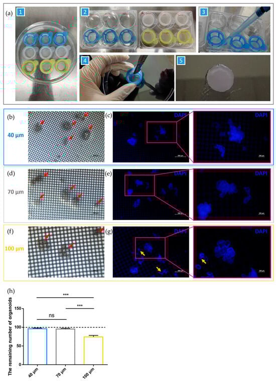 As described in Section 4.3, mature intestinal organoids were collected and centrifuged in precooled phosphate buffer solution (PBS) to remove Matrigel after seven days of culture. Approximately 100 organoids with different pore sizes were transferred into each strainer. The organoids were washed, fixed, permeated, and blocked in a 100 mm dish using a strainer platform (Figure 3a, step 1) and transferred to six-well plates for immunolabeling (Figure 3a, step 2). The liquid was added above the strainers and aspirated between the strainers and the dish (Figure 1 and Figure 3a, step 3). The mesh surfaces of the strainers were carefully cut with a scalpel, and the organoids were not disturbed. Finally, the strainers were inverted at the bottom of the confocal dish for observation (Figure 3a, steps 4 and 5).