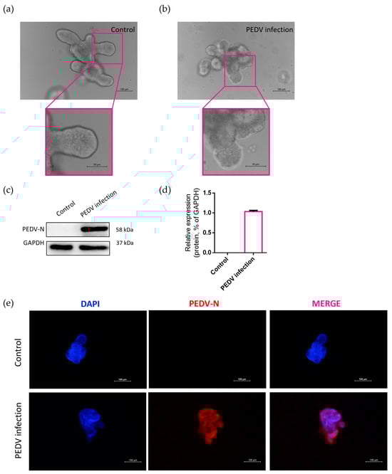 Identification of organoids infected with PEDV and a methodological exploration of a labeling virus infection model based on the strainer platform. (a,b) Infected and uninfected intestinal organoids were observed (scale bar = 100 μm). The enlarged graphs were located below (scale bar = 50 μm); (c,d) Western blot analysis identified PEDV infection in intestinal organoids, and the protein gray value was detected; (e) PEDV-N protein was fluorescently labeled and imaged (scale bar = 100 μm).
