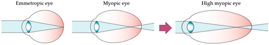 Myopia is the most common eye disorder in the world [1]. From a physiological point of view, it involves a refractive error where the light rays entering the eye focus on a point in front of the retina, leading to decreased visual acuity. This refractive error is due to a postnatal axial elongation of the eye in the process of emmetropization [2,3]. Although myopia is usually considered a benign condition that can be corrected with the use of glasses, contact lenses or refractive surgery, it is becoming a public health concern due to its increasing prevalence in younger populations and its progression to its most severe and pathological form, high myopia (HM) (Figure 1). HM is defined as a spherical refractive error exceeding –6.00 spherical diopters (SD) or an axial length (AL) greater than 26 mm [4,5].