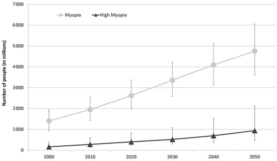 Graph representing the number of people estimated to develop myopia and HM for each decade from 2000 to 2050 [6].