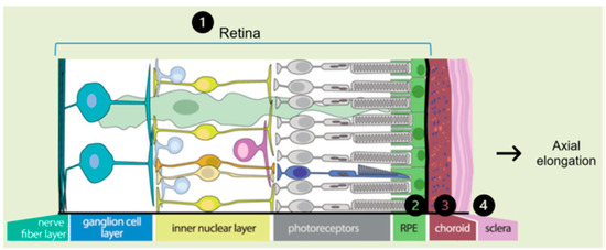 - Visual feedback driven by optical defocus. The defocus signal is detected by the retina and triggers a multilayered signaling cascade involving a large number of coding and regulatory genes, sequentially affecting the retina, retinal pigment epithelium (RPE), choroid, sclera and its extracellular matrix (ECM). In this last step of the cascade, changes occur in the composition of the ECM and are reflected in axial elongation (Figure 3). Alterations in these genes and their function can disrupt emmetropization and result in excessive axial length [2].