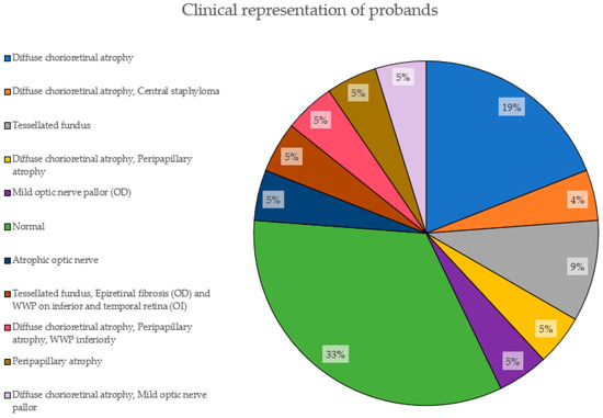 Clinical representation of probands. The proportions of features presented by the probands in this study are shown here, with their corresponding percentage.