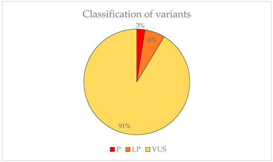 We found 83 variants that may be involved in the development of EoHM. Two (3%) were classified as P, five (6%) was LP and 74 (91%) was VUS (Figure 6). The American College of Medical Genetics (ACMG) criteria for classifying pathogenic variants may be observed in Table A1.