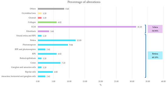 The classification of genetic alterations affecting visual feedback may be divided into two main groups: those involved in the retina, affecting the function of photoreceptors, RPEs, and ON and OFF bipolar neurons; and those that occur in the sclera, affecting the composition and metabolism of the ECM [5].