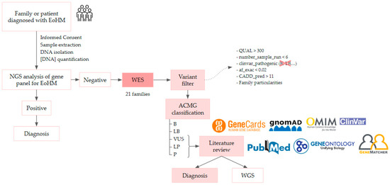 In this study, next-generation sequencing (NGS) was used to sequence the whole exome of 21 families diagnosed with EoHM. Whole-exome sequencing makes it possible to study alterations and their involvement in a larger number of genes, thus allowing for the diagnosis and proposal of new candidate causal genes for EoHM in patients.