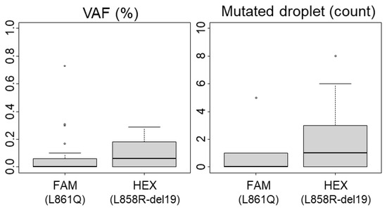 Limit of Blank (LoB) for ddPCR analysis. The variant allelic fraction (VAF) and the number of mutated droplets were determined using 34 wild-type (including polymorphisms) samples after performing ddPCR analyses. Boxplots representing mediane and quartiles (75%, 25%) are show, outliers are depicted by circles The L861Q mutation is detected in the FAM channel and L858R mutations or exon 19 deletions are detected in the HEX channel.