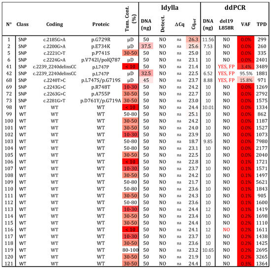 Specificity determination. Thirty-four samples, determined to be wild type (N = 24) or bearing a polymorphism (SNP; N = 10) by NGS, were assessed using both testing strategies. Three variants at positions p.747 and p.742 produced a signal in ddPCR, but they can be distinguished from real mutated signals (see Figure S3). WT: wild type, SNP: Single nucleotide polymorphism, VAF: variant allelic fraction in percentage, TPD: total positive droplet count, Tum. Cont.: tumor content in percentage, µD: microdissected sample, FP: false positive. Gradient of red cases represents samples with data exceeding the established thresholds for Idylla (Cqref > 26 and DNA < 50 ng) and ddPCR (TPDs < 200, DNA < 5 ng, or VAF < 50%.