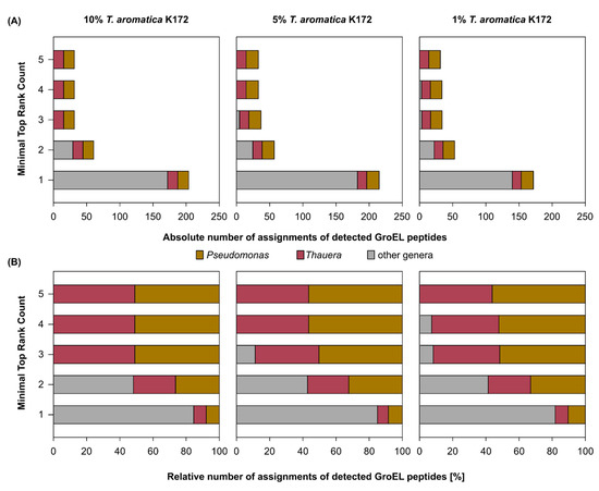 To evaluate the applicability of GroEL peptide mass spectrometry for relative quantification of subpopulations, we experimented with a synthetic mixture of T. aromatica K172 and P. putida KT2440. Initially, each of the two strains was cultivated separately. Subsequently, proteins were extracted from them, and crude extracts of T. aromatica K172 and P. putida KT2440 were mixed in predetermined protein ratios, ensuring a total protein mass of 5 µg. Before nLC-MS/MS analysis, GroEL was separated from other proteins by SDS-PAGE, decreasing the heterogeneity of the sample, which resulted in a 1.8-fold increase in the number of detected GroEL peptides. Peptides often can be assigned to multiple proteins, known as the protein inference problem. Furthermore, large databases tend to increase the number of false-positive detections. To remove false-positive detections and to infer proteins and taxonomy unambiguously, we developed a custom Python script that filters GroEL protein groups by the Top Rank Count, which only counts peptides once for the largest GroEL protein group (for the description of this filtering routine, see Section 4).