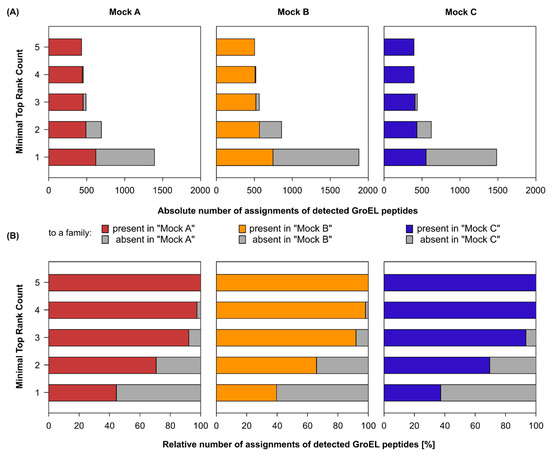 Evaluating sensitivity (A) and specificity (B) of GroEL-proteotyping using different Top Rank Count filtering thresholds in detecting peptides assigned to bacterial families that were present in three synthetic microbial communities (Mock A–C) assembled by Kleiner et al. [20]. The detected peptides were assigned to specific GroEL proteins. GroEL proteins with the same set of detected peptides were merged into GroEL groups, which were then filtered by the Top Rank Count ≥ 5. Bars represent the means of four biological replicates.