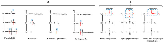 (A) Site activities of different phospholipases on membrane lipids. (B) Different linkage types in phospholipids. Abbreviations: 1, phospholipase A1; 2, phospholipase A2; 3, phospholipase C; 4, phospholipase D; 5, ceramidase; 6, lipid phosphate phosphatase; 7, sphingomyelin deacylase; 8, sphingomyelinase; R, fatty acid; X, head group.