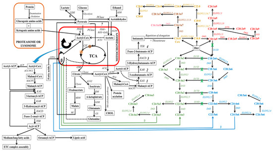 Schematic depiction of eukaryotic fatty acid biosynthesis and modification pathways, with emphasis on enzyme involvement (in italics). In this schematic, mitochondria are denoted by the red box, while proteasome/ribosome components are indicated by the orange box. However, light orange text delineates the elongation pathway for diverse saturated fatty acids. Within the diagram, both green and blue hues, accompanied by corresponding colored arrows, elucidating the discrete pathways for n3 and n6-fatty acid synthesis, respectively. On the other hand, text with color spectrum transitioning from pink to red designates the pathways for the synthesis of various monounsaturated fatty acids. The green “X” indicates the unattainability of this pathway in mammals, particularly higher eukaryotes, owing to the absence of a specific enzyme. ELOVL8 is a fish-specific elongase. Abbreviations: 1, condensation; 2, reduction; 3, dehydrogenation; 4, reduction; 5, aerobic conditions; 6, hypoxia or anaerobic conditions; 7, aerobic conditions; ACC, acetyl-CoA carboxylase; ACP, acyl carrier protein; ACPT, acyl carrier protein transacylase; ACS1, acetyl-CoA synthetases-1; ACS2, acetyl-CoA synthetases-2; ADH, alcohol dehydrogenase; ALDH, aldehyde dehydrogenase; ACO2, aconitase; β, beta oxidation; CHOL, cholesterol; CIT, citrate synthase; Clyase, citrate lyase; CPT-I, carnitine-palmitoyl transferase-I; CTP, citrate transporter protein, EAR, enoyl-ACP reductase; ETC, electron transport chain; GDH, glutamate dehydrogenase; GS, glutamine synthetase; HACD, β-hydroxyacyl-ACP dehydrase; IDH, isocitrate dehydrogenase; KAD, keto acid dehydrogenase; KAR, β-ketoacyl-ACP reductase; KAS, β-ketoacyl-ACP synthetase; MACPT, malonyl-CoA:ACP transacylase; MDH, malate dehydrogenase, MI, malic enzyme, PCase, pyruvate carboxylase; PCC, propionyl-CoA carboxylase; PDH, pyruvate dehydrogenase; ROS, reactive oxygen species; TCA, tricarboxylic acid cycle; TER, trans-enoyl-ACP reductase; O, oxaloacetate; *, citric acid).
