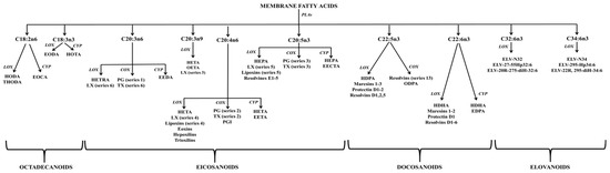 - Dyall, S.C.; Balas, L.; Bazan, N.G.; Brenna, J.T.; Chiang, N.; da Costa Souza, F.; Dalli, J.; Durand, T.; Galano, J.-M.; Lein, P.J.; et al. Polyunsaturated fatty acids and fatty acid-derived lipid mediators: Recent advances in the understanding of their biosynthesis, structures, and functions. Prog. Lipid Res. 2022, 86, 101165. [Google Scholar] [CrossRef] [PubMed]