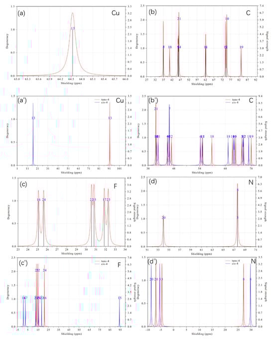 NMR spectra of Cu, C, F, N, and H atoms before and after they formed trans-4 and cis-4, which can also be used to distinguish trans-4 from cis-4. The parts (a–e) are before complex; (a’–e’) trans-4 and cis-4; and (f,g) trans-4 and cis-4 with labels, respectively.