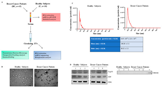 EVs were isolated from the blood serum of healthy subjects (C), and patients with breast cancer (BC), and their clinicopathological characteristics are summarized in Table 1.