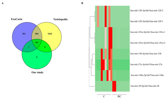 Differentially expressed EV-miRNAs in healthy subjects and breast cancer patients measured by RNA-seq. (A). Venn diagram of the known miRNAs in our study, vesicular Vesiclepedia and ExoCarta databases. (B). Heatmap of the differentially expressed EV-miRNAs in healthy subjects (C) and breast cancer patients (BC). The red and the green color scale indicate an increase and a decrease in miRNA expression levels, respectively.