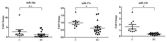 Quantitative real-time PCR (qRT-PCR) of miRNA expression profiling data in the validation cohort of healthy subjects (C) and breast cancer patients (BC). qRT-PCR was conducted to measure the miRNA expression levels of miRNA-28p, miRNA-27a and miRNA-128, as described in Materials and Methods. Data were reported as mean ± S.E.M. n.s. = not significant; * p < 0.05.