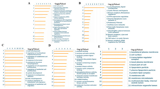 MetaCore gene enrichment analysis of 18 target genes obtained by MIENTURNET analysis. Top 12 most significantly enriched pathways for (A) process networks, (B) disease biomarker networks, (C) GO processes, (D) GO molecular functions, and (E) GO localization ontologies are listed.
