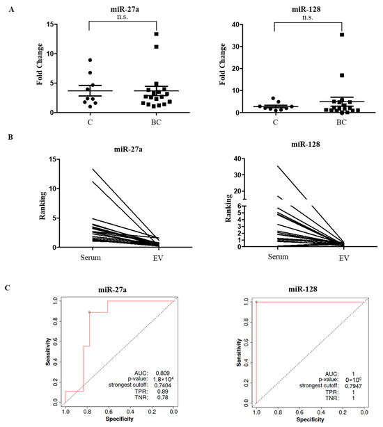 Diagnostic potential of circulating EV-derived miRNA-27a and miRNA-128 in breast cancer. (A). qRT-PCR was utilized to assess the levels of freely circulating miRNA-27a and miRNA-128 in the serum samples of healthy subjects (C) and breast cancer patients (BC). n.s. = not significant. (B). A paired dot plot shows the ranking of breast cancer patients according to miRNA-27a and miRNA-128 levels in EVs and serum; lines connect samples from the same individual. (C). Receiver operating characteristic (ROC) curves plotted for diagnostic potential of serum EV-derived miRNA-27a, and miRNA-128 in discriminating patients with breast cancer from healthy individuals. The corresponding AUC, sensitivity (TPR), and specificity (TNR) values are reported.