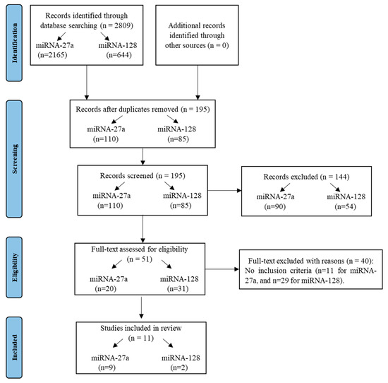 The present study followed the Preferred Reporting Items for Systematic Review and Meta-Analysis (PRISMA) [101]. An online literature search for miRNA-128 and miRNA-27a was conducted in the PubMed database between 7 May 2023, and 5 June 2023 to obtain all studies related to the predictive diagnostic performance of these miRNAs in human breast cancers. Our search strategy was based on a combination of keywords and Boolean operators organized as it follows: (1) MicroRNA* OR “Micro RNA” OR “RNA Micro” OR miRNA* OR pri-miRNA* OR stRNA* OR pre-miRNA*; (2) Small AND Temporal AND RNA*; (3) 1 OR 2; (4) 128; (5) 3 AND 4; (6) miR-128 OR microRNA-128 OR hsa-mir-128 OR miRNA-128 OR micro-RNA-128 OR pri-miRNA-128 OR stRNA-128 OR pre-miRNA-128; (7) 5 OR 6; (8) “MicroRNAs” [Mesh]) AND 128; (9) 7 OR 8; (10) neoplas* OR tumo* OR cancer*; (11) 9 AND 10. The same strategy was used to replicate miRNA-27a expression. Two review authors (I.B. and S.C.) independently screened the titles and abstracts to identify all available articles for eligibility. A publication filter was not applied to the database. Following this, the review authors independently performed a full-text review of the articles identified through screening. Screening for titles and abstracts and full-text screening were performed using a standardized form with explicitly predefined inclusion and exclusion criteria. A manual search of study references was performed for completeness. Studies were considered for inclusion if they met the following criteria: (1) full original articles published in English; (2) articles concerning the evaluation of cell-free miRNAs in human biofluids from breast cancer patients; (3) recruitment of more than 10 participants for the study; (4) sample collection before surgical resection or other therapeutic treatments; (5) no declared concomitance with other diseases; and (6) analysis of miRNA levels for diagnostic purposes. Exclusion criteria were: (1) studies showing duplicate databases; (2) reviews of the literature, editorial notes, posters, clinical case reports, meta-analyses, conference abstracts, letters to the editor, theses, dissertations, and book chapters; (3) and experiments without a control group or comparison group. Any disagreements between the reviewers were resolved through discussions and mutual consent between reviewers.