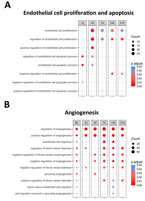 Endothelial cell proliferation, apoptosis-related BPs, (A) and angiogenesis-related BPs (B) overrepresented at each time point after coronary occlusion. Myocardial infarction groups are in the columns, while the rows represent the different BPs. The size of the circle indicates the number of overexpressed genes, whereas the colors ranging from red to blue represent adjusted p-value, as shown in the legend. The red circles in the figure indicate lower p-values, while the blue represent higher p-values. Abbreviation. BP: biological process.