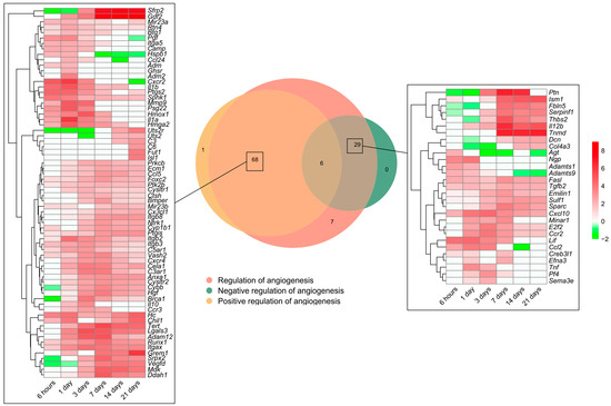 Genes related to angiogenesis regulation in a myocardial infarction scenario. The Venn diagram represents the GO included in the BPs underlying the regulation of angiogenesis (GO: 0045765), positive regulation of angiogenesis (GO: 0045766), and negative regulation of angiogenesis (GO: 0016525). According to the Venn diagram, 68 genes were implicated in the positive and 29 in the negative regulation of angiogenesis. Heatmaps of the log2-fold change of the genes included in the cross-section groups are represented at each time point after ischemia onset. Myocardial infarction groups are in the columns and genes in the rows. Gene intensities were log2-transformed and are displayed in colors ranging from red to green, as shown in the key. The red squares in the figure represent high-expression genes, while the green squares represent low-expression genes. The rows are clustered using correlation distance and average linkage. Abbreviations. BP: biological process. GO: gene ontology.