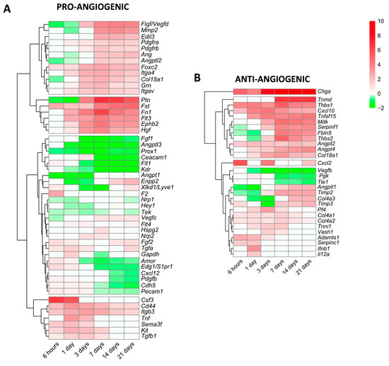 Heatmap of the log2-fold change of pro-angiogenic (A) and anti-angiogenic (B) genes at different time points after coronary reperfusion. Columns show myocardial infarction groups and the different genes encoding angiogenesis-related genes are in the rows. Gene intensities were log2-transformed and are displayed as colors ranging from red to green, as shown in the key. The red squares in the figure represent high-expression genes, while the green squares represent low-expression genes. Both the rows and columns are clustered using correlation distance and average linkage.