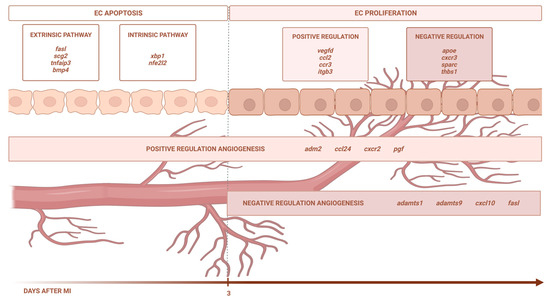 Using eight independent RNA sequencing studies derived from infarcted tissue isolated at various time points after coronary occlusion, we found that the transcriptomic level of genes participating in EC apoptosis (via the extrinsic and intrinsic pathways) increases up to day 3 after ischemia onset, whereas EC proliferation occurs from day 3 onwards. In terms of angiogenesis modulation, the BPs implicated in new vessel formation are overrepresented as early as ischemia onset, while mechanisms aiming at inhibiting this process are detected from day 3 onwards. Lastly, we identified up to 51 different pro-angiogenic and 29 anti-angiogenic factors displaying altered transcriptomic expression post-infarction (Figure 6).