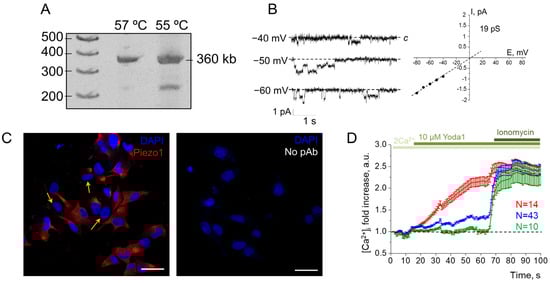 Functional expression of mechanosensitive Piezo1 channels in SK-MEL-2 cells. (A) RT-PCR showing the presence of hPIEZO1 mRNA in SK-MEL-2 cell lysates. The obtained length of the product (360 bp) was as expected. Original gel is available in Supplementary Figure S1. (B) Representative whole-cell recordings of Yoda1-induced Piezo1 activity in response to 1 µM Yoda1. Single-channel conductance and reversal potential were similar to Yoda1-induced Piezo1 channels described earlier [6]. c—closed state (zero current, baseline). (C) Immunofluorescence staining of Piezo1 in SK-MEL-2 cells. Red channel—Piezo1, blue channel—DAPI. Note that the number of cells is Piezo1-negative (marked by the arrows). Scale bar is 50 μm. As a control, staining of the cells only with fluorescent secondary antibodies was carried out (no pAb, no red fluorescence signal was observed). (D) Ca2+ responses of SK-MEL-2 cells to Yoda1 application in the representative experiment with n = 67 cells (from N = 3 independent Ca2+ measurements). Note that three populations of the cells could be distinguished (see Results and Discussion). Shown are mean fold changes (±S.D.) of Fluo8 fluorescence, normalized to the fluorescence at the starting point (first frame). Note that all cell populations had similar reactions to calcium ionophore ionomycin (5 μM), indicating the specificity of Yoda1-induced Ca2+ responses.