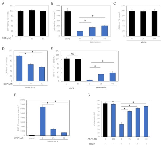 To investigate the effect of CDP on skin aging, we treated young and senescent NHDF with CDP and determined the cell viability. After 72 h of treatment with CDP (25 μM and 50 μM), cell viability was significantly increased in highly senescent NHDF, although mitotic potential was reduced in the senescent cells. However, this treatment did not affect young low-successional NHDF (Figure 1A,B). In senescent NHDFs, cell damage during normal culture, measured using lactate dehydrogenase (LDH) release, was reduced by CDP treatment; however, the treatment did not affect LDH release in young NHDFs (Figure 1C,D). Furthermore, BrdU assay, which evaluates proliferative capacity, showed a significant improvement in proliferative capacity in CDP-treated senescent NHDFs, while the proliferative capacity of young cells was unaffected (Figure 1E). CDP treatment significantly decreased ROS production in senescent NHDFs (Figure 1F).