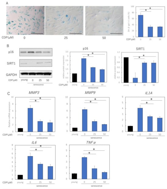 We evaluated the effects of CDP treatment on the senescent phenotype of NHDFs. The percentage of senescence-associated (SA)-β-galactosidase-positive NDHF was significantly reduced by CDP treatment (Figure 2A). The treatment reduced p16 expression, a typical aging marker protein, and restored SIRT1 expression, which had decreased with aging (Figure 2B). Furthermore, CDP treatment significantly suppressed the expression of IL1A, IL6, MMP3, MMP9, and tumor necrosis factor (TNF)-α, which are the typical SASP factors of aging NHDFs in skin (Figure 2C). In the NHDF culture model, the number of cells with reticular phenotype and SMA-positive myofibroblasts increased with increasing number of NHDF passages. We evaluated the effect of CDP treatment on the percentage of α-SMA-positive cells; CDP treatment reduced the number of α-SMA-positive cells in highly passage-senescent NHDF (Figure 2D,E). Furthermore, CDP treatment suppressed the expression of α-SMA in senescent HDFs even at the mRNA level (Figure 2F).