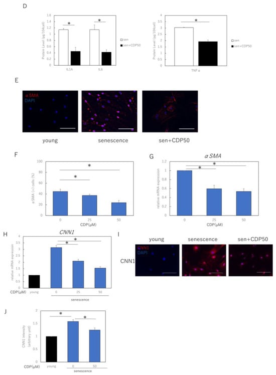 Effects of CDP on the aging phenotype of NHDFs. (A) Effect of CDP on SA-β-galactosidase activity. Bar = 100 µm; (B) effect of CDP on expression of aging-related protein p16 and longevity protein SIRT1; (C) effect of CDP on the expression of SASP-associated genes; (D) effect of CDP on the amounts of SASP-related proteins in cell culture medium; (E,F) changes in αSMA expression induced by CDP treatment (fluorescence immunostaining). Red: αSMA, blue: DAPI (nuclei). Percentage of SMA-positive cells per total cells was calculated from 15 microscopic fields of view in each group; Bar = 100 µm; (G) CDP treatment-induced changes in αSMA gene expression; (H) expression of CNN1 (reticular marker) in the CDP-treated NHDFs; (I) changes in CNN1 expression in the CDP-treated NHDFs (fluorescence immunostaining). Red: αSMA, blue: DAPI (nuclei). Bar = 50 µm. (J) Evaluation of fluorescence intensity in the CNN1 positive regions. Calculated from five microscopic fields of view for each group. Bar = 100 µm. * p < 0.05.