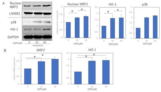 Cellular senescence is a persistent state of cell-cycle arrest that occurs after exposure to various stressors. OS is characterized by increased ROS production and is implicated in the pathophysiology of many aging-related diseases, including diabetes, cardiovascular disease, inflammation, cancer, degenerative diseases, ischemia, and anemia []. The inflammation is accompanied by increased or excessive ROS production by activated inflammatory and immune cells, which causes further damage and exacerbate OS and the inflammation loop; cytokines, chemokines, and the growth factors released by the ROS-induced signals enhance inflammation []. Therefore, inflammation, OS, and aging are closely associated with each other. Therefore, natural substances with antioxidant properties that reduce ROS are potential effective therapeutics for alleviating diseases caused by OS as they act as a shield against free radicals and ROS production []. In this study, CDPs reduced the generation of intracellular ROS, suggesting that the mechanism involved the activation of the NRF2/HO-1 antioxidant pathway. Several studies have shown that the Nrf2 signaling cascade plays an important role in inflammatory diseases and OS [].