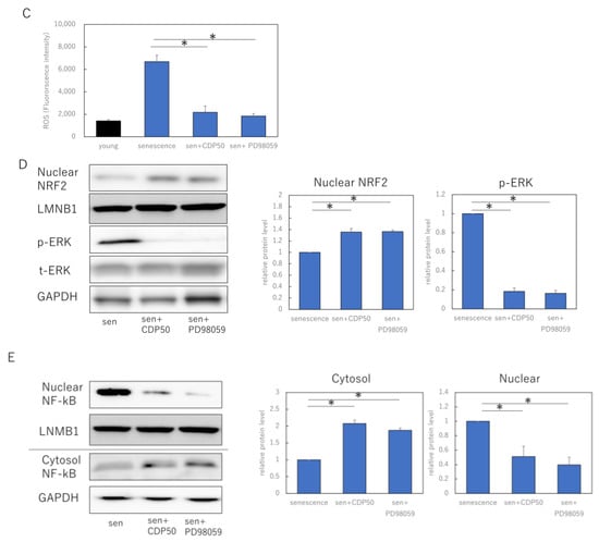 NHDFs were purchased from PromoCell (Heidelberg, Germany) and cultured in 10% heat-inactivated fetal bovine serum, penicillin and streptomycin, Dulbecco’s modified Eagle’s medium (Fujifilm Wako Pure chemical) at 37 °C in a 5% CO2 incubator. Replicative senescence was defined as a cell population doubling level (PDL) of ≥50 and no growth for more than 2 weeks. Otherwise, low passages were defined as PDL 10–20. OS induction by H2O2 was performed by exposing the intermediate passage (PDL 30) HDF cells (80% confluence) to 200 μM H2O2 (Fujifilm Wako Pure Chemical) for 2 h. Cells were rinsed with PBS, pH 7.4, and then added to fresh complete medium and subjected to analysis and treatment for 48 h after H2O2 stress. Cell division ability was assessed using the BrdU Cell Proliferation Kit (Sigma-Aldrich, St. Louis, MO, USA) according to the manufacturer’s protocol. Proliferating cells, replicative senescent cells, and H2O2 OS cells were plated in 96-well plates (5 × 103 cells per well, n = 5) and maintained in 100 µL of medium; after 24 h, the cells were treated with the indicated concentrations of either CDP (25, 50 µM) or PD98059 (25 µM) and subjected to analysis after 72 h of incubation. Cell viability was analyzed using the CellTiter-Glo® 2.0 Cell Viability Assay (Promega, Madison, WI, USA). PBS was administered as a negative control and the data were normalized against the control.